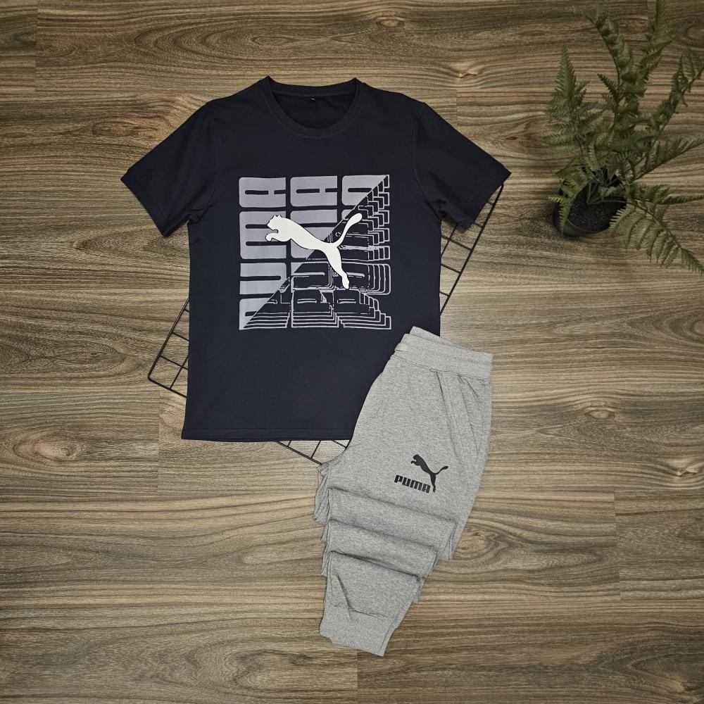 تيشيرت كحلي يحمل شعار Puma المميز بتصميم هندسي جذاب، يمنح الطقم لمسة عصرية شبابية.